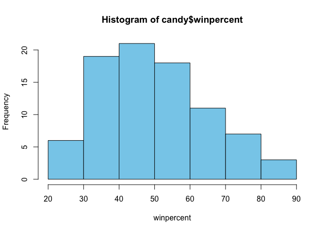hist(candy$winpercent, xlab = "winpercent", col = "skyblue")
