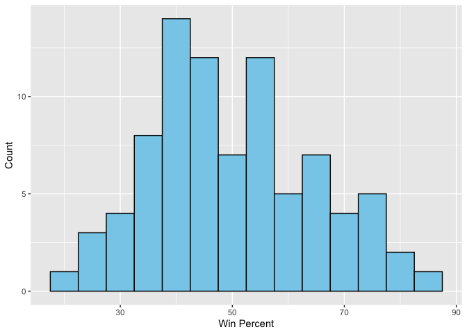 | winpercent | 0 | 1 | 50.32 | 14.71 | 22.45 | 39.14 | 47.83 | 59.86 | 84.18 | ▃▇▆▅▂ |