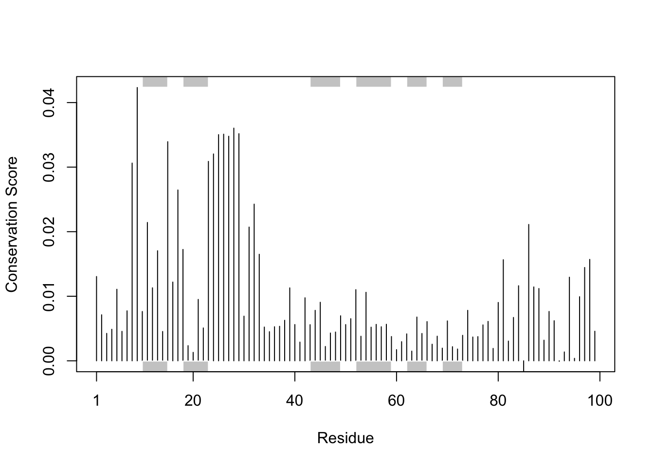 We can score residue conservation in the alignment with the conserv() function.