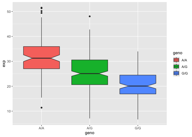 ggplot(expr) + aes(geno, exp, fill=geno) + geom_boxplot(notch=TRUE)