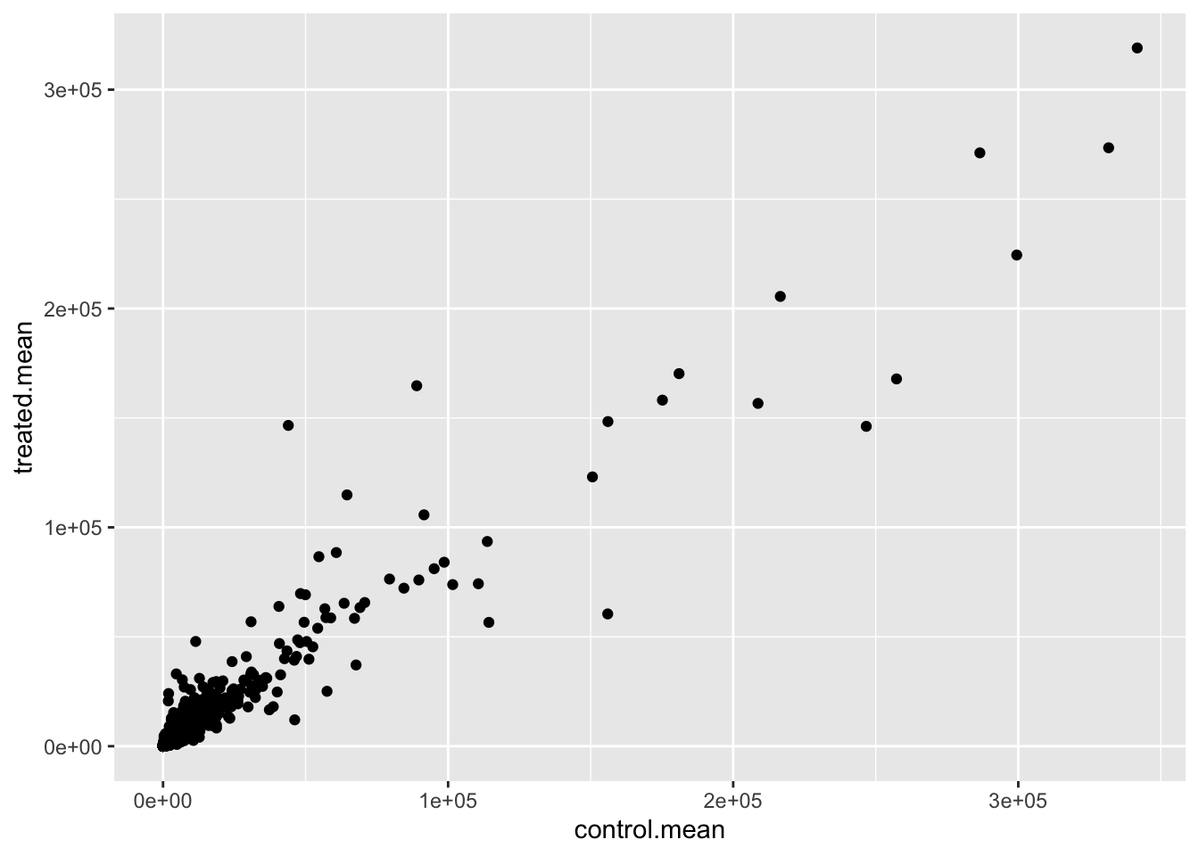 meancounts <- data.frame(control.mean, treated.mean)Let’s make a plot to explore these results a little