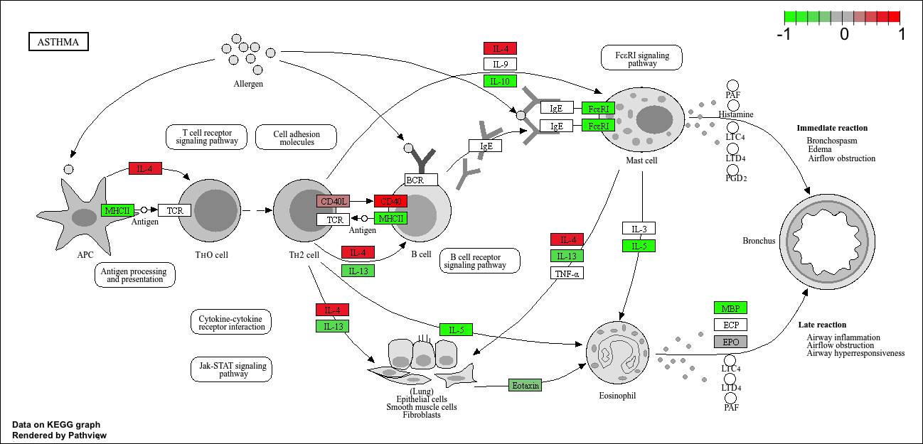 Let’s see the hsa05310 Asthma pathway with our DEGs colored up: